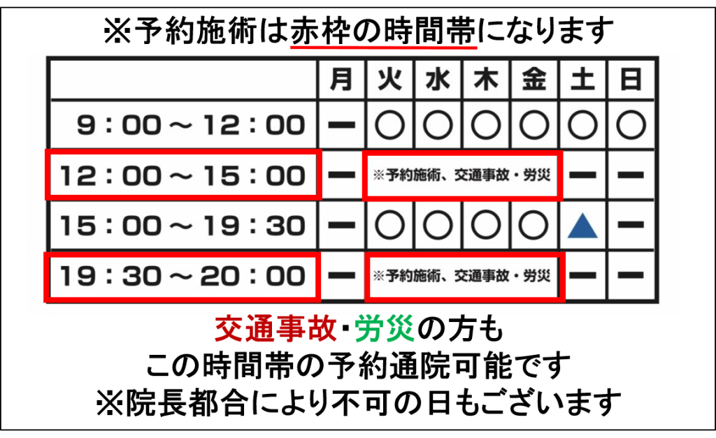 初診時は受付で健康保険証のご提示をお願いします。問診票をお渡ししますのでお体の状態やお悩みを詳しくご記入ください。