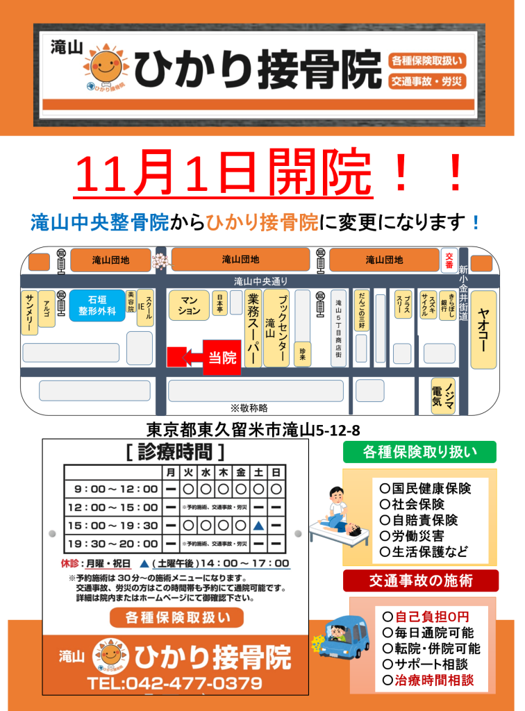 Categories お知らせ一覧 令和7年11月1日 開院 Post author By 院長 Post date 2025年10月11日 滝山中央整骨院から『ひかり接骨院』に変更になります場所は滝山5丁目バス通りから1つ奥の道に入ります ← 肘内障