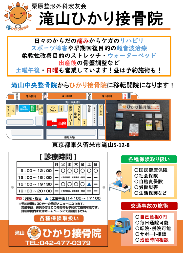 Categories お知らせ一覧 令和7年11月1日 移転開院 Post author By 院長 Post date 2025年10月11日 滝山中央整骨院から『ひかり接骨院』に名称変更になります場所は滝山5丁目バス通りから1つ奥の道に移転致します ← 肘内障 → 予約特別施術メニュー